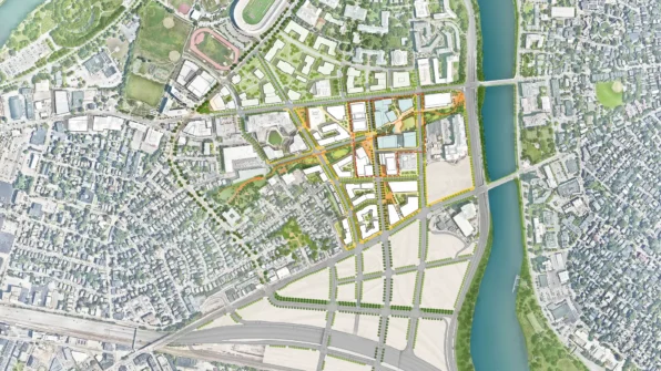 Once home to a vast industrial yard, the new district sits at a key intersection in the city, located between Harvard’s business school and Science and Engineering Complex, the Charles River, and a major public transit hub planned just to the south. Looking to strengthen relationships between Allston’s residents, academics, and industry leaders, the plan for the ERC proposes a continuous public greenway, with bike and pedestrian paths, that weaves the district together and provides a range of outdoor areas from intimate groves to a large civic plaza for programming throughout the year.