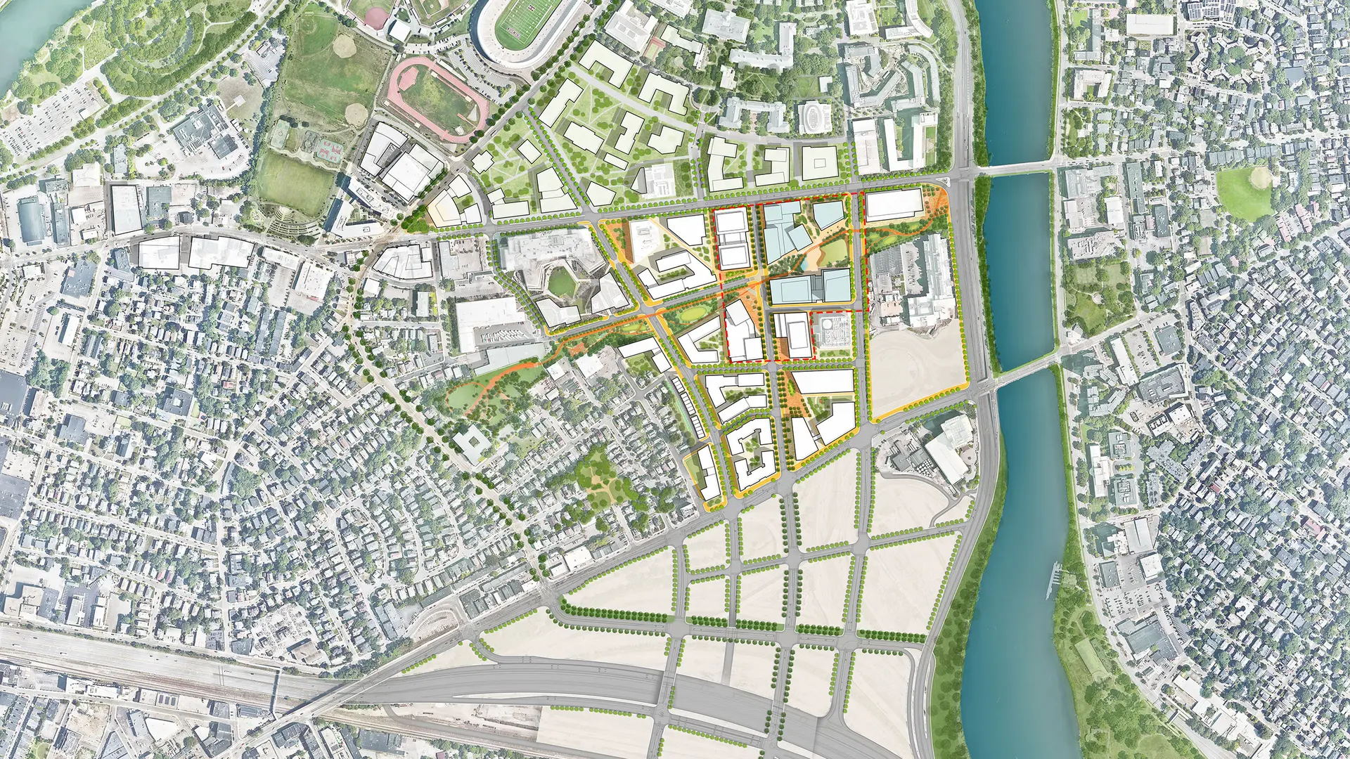 Permeable edges and pedestrian-friendly paths invite people to explore a network of diverse green spaces for gathering and collaborating year-round, setting up to new linkages to the Charles River and wider region and promoting interaction and connection at every scale.